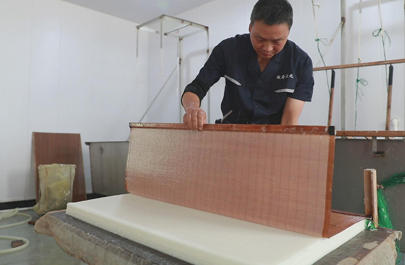 徽州傳統(tǒng)手工楮皮紙,采用傳統(tǒng)手工抄紙工藝,經(jīng)過27道工序,以手工精細(xì)制作而成,產(chǎn)品主要有楮皮紙、云龍紙、皺紋紙、落水紙、棉紙、版畫、攝影畫、手撕畫專用紙。 生產(chǎn)工序: 浸泡—→腳踏—→清水蒸煮—→切料—→石灰漿浸泡—→蒸煮—→自然漂洗—→腳踏