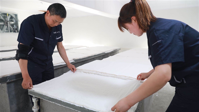 10月9日下午,縣長(zhǎng)吳云忠赴海陽(yáng)鎮(zhèn)凝霜文化發(fā)展公司調(diào)研徽州楮皮紙傳承與發(fā)展工作,縣委常委、海陽(yáng)鎮(zhèn)黨委書記金學(xué)年,縣委常委、縣政府副縣長(zhǎng)程衛(wèi)華參加調(diào)研活動(dòng)。 吳云忠一行實(shí)地察看了徽州楮皮紙生產(chǎn)工藝流程,認(rèn)真聽取企業(yè)負(fù)責(zé)人介紹,詳細(xì)詢問徽州楮皮紙制作工藝