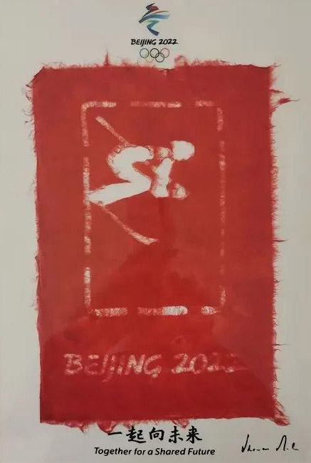 下圖便是使用徽州楮皮紙制作的北京冬奧會紙藝作品紀念品。一張厚實的白色襯紙上張貼著特別裁剪過的紅色襯紙,映出栩栩如生的高山滑雪樣式和“BEIJING 2022”字樣,十分高雅。